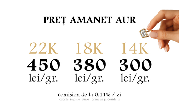 Încheie un contract de amanet pe o perioadă de maximum 30 de zile și ai PREȚ COMPETITIV AMANET AUR: 450 lei / g 22k, 380 lei / g 18k, 300 lei / g 14k. Comision începând cu 0.11% / zi. Campanie valabilă si pentru contractele active.