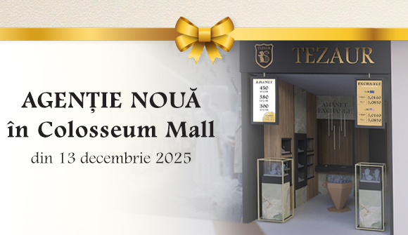 Vino la TEZAUR Colosseum! Te așteptăm cu multe surprize: voucher cadou de 300 lei, reduceri de până la 60% la bijuterii din aur și cu diamante, comision 0% la amanet aur în prima lună și schimb valutar negociabil. Campanie valabilă: 13 decembrie 2025 - 10 ianuarie 2026.
